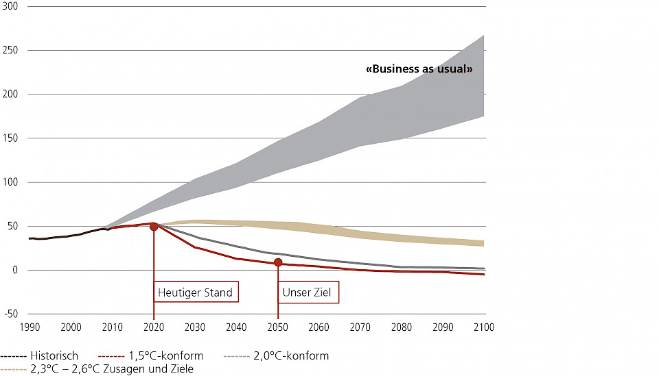 Um bis 2050 das Ziel von Netto-Null-Emissionen zu erreichen, wird die Gesellschaft grosse Anstrengungen unternehmen müssen, damit das 1,5°C-Szenario auch tatsächlich erreicht werden kann (vgl. Abb.). Zu den am häufigsten genannten Massnahmen gehört, dass Unternehmen von Jahr zu Jahr eine Reduktion ihrer CO2-Emissionen umsetzen müssen. Gemäss den Mindestanforderungen des EU-Referenzwerts für auf das Pariser Übereinkommen abgestimmte Investitionen liegt die jährliche Vorgabe bei 7%. Das stünde im Einklang mit einem Gleitpfad von 2,0°C, wobei einigen Studien zufolge jedoch eine strengere Vorgabe festgelegt werden sollte¹. Die MSCI Climate Paris Aligned-Indizes, die von unserer neuen ETF-Familie abgebildet werden, setzen die Messlatte ein Stück höher und basieren auf einem Gleitpfad mit einer Reduktion der CO2-Emissionen von 10% gegenüber dem Vorjahr.