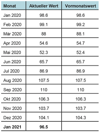Das KOF-Konjunkturbarometer fällt im Januar auf 96,5 Punkte und damit unter seinen langjährigen Durchschnittswert von 100. Der Rückgang beträgt im Vergleich zum Vormonat 7,6 Punkte. Im Dezember stand das Barometer noch bei 104,1 Punkten (revidiert von 104,3) und damit über der Durchschnittsmarke, wie die Konjunkturforschungsstelle der ETH Zürich am Freitag bekannt gegeben hat.