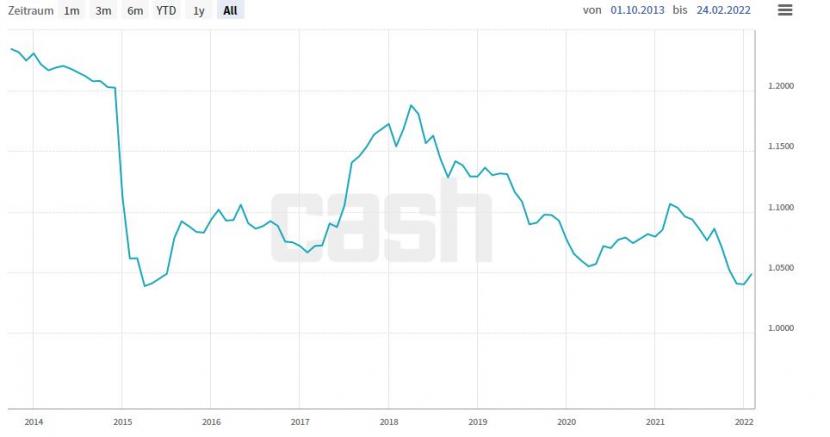 Der russische Angriff auf die Ukraine hat die Flucht in sichere Häfen verstärkt. Der Euro hat sich allerdings über den Vormittag etwas erholt, der Kurs bleibt aber nur wenig über der 1,03-Linie. Könnte der Konflikt den Kurs auf die Parität fallen lassen?