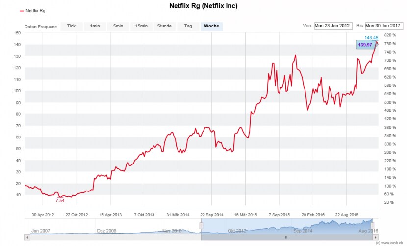 Der Umsatz wuchs im Vergleich zum Vorjahr um 40 Prozent auf 2,35 Milliarden Dollar. Der Gewinn stieg von 43 auf 67 Millionen Dollar. Mit diesen Zahlen übertraf Netflix sämtliche Erwartungen, worauf die Aktie auf ein neues Allzeithoch schoss. Derzeit notiert sie bei 142 Dollar – mehr als 50 Prozent höher als vor Jahresfrist.