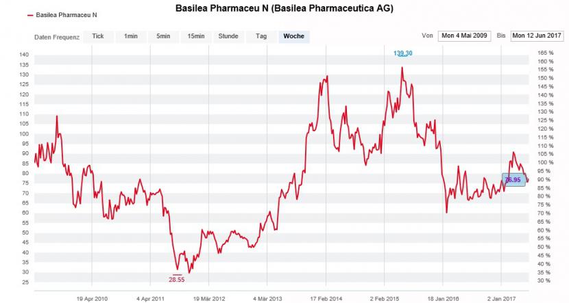 Basilea fristet ein Mauerblümchen-Dasein, und das schon seit Monaten. Obwohl die Aktie des Pharmaherstellers aus Basel in den letzten Tagen wieder etwas Auftrieb hatte, trennen sie noch immer knapp 20 Prozent von den vorläufigen Jahreshöchstkursen bei 95,35 Franken von Ende März. Während sich viele Schweizer Nebenwerte von einem Rekord zum nächsten hangelten, erwiesen sich die letzten vier Jahre aus Sicht der Basilea-Aktionäre als ein Nullsummenspiel.