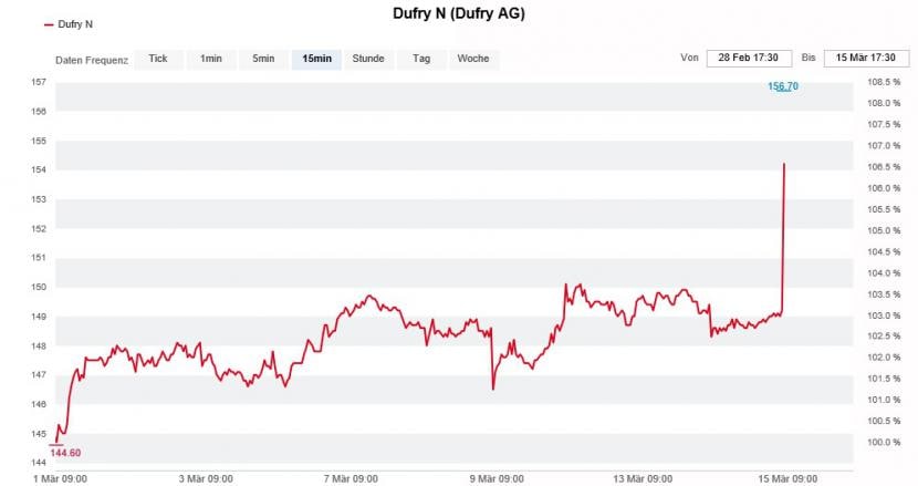 An der Schweizer Börse SIX klettert die Dufry-Aktie deshalb um weitere 2,3 Prozent auf 152,60 Franken und damit auf den höchsten Stand seit September 2014. Zeitweise wurden sogar Kurse von bis zu 156,70 Franken bezahlt.