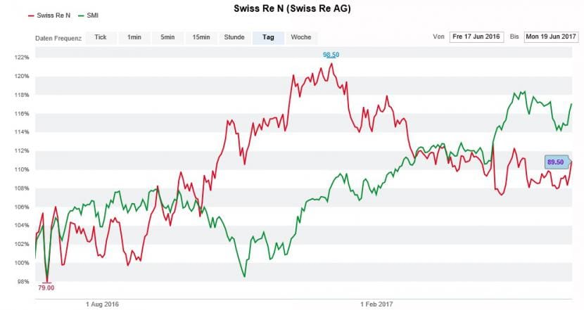 Der SMI (grün) lässt die Swiss-Re-Aktie (rot) hinter sich zurück (Quelle: www.cash.ch)