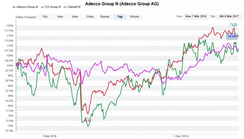 Die Aktien von Adecco (rot), Credit Suisse (grün) und Clariant (violett) bewegen sich nahezu im Gleichschrit (Quelle: www.cash.ch)