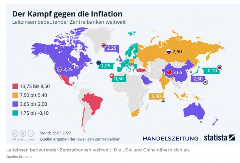 In der westlichen Welt gehen die britische Bank of England und die Federal Reserve in den USA mit den Zinserhöhungen voran. Grossbritannien bekämpft dabei zusätzlich zur Inflation auch noch den drastischen Verfall des Pfunds.