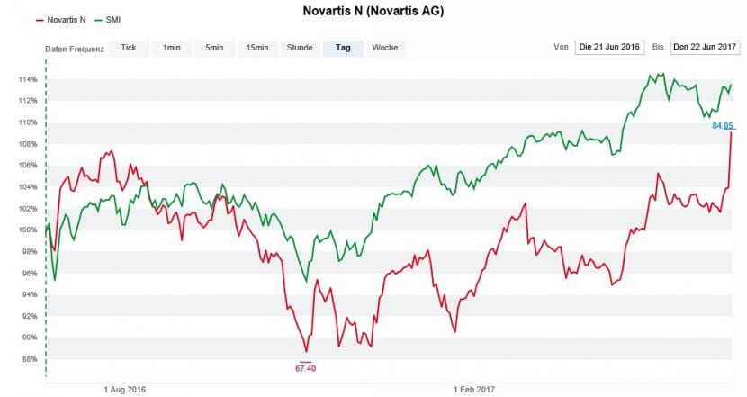 Die Novartis-Aktie (rot) ist dem SMI (grün) auf den Fersen (Quelle: www.cash.ch)