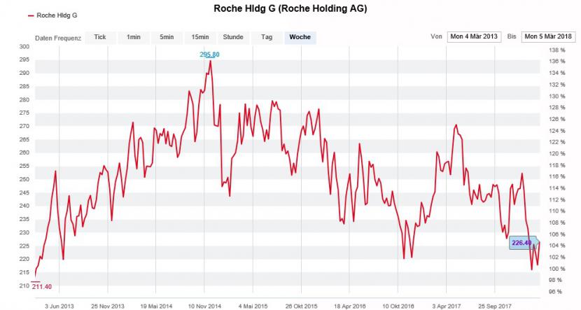 Kursentwicklung des Roche-Genussscheins über die letzten fünf Jahre (Quelle: www.cash.ch)