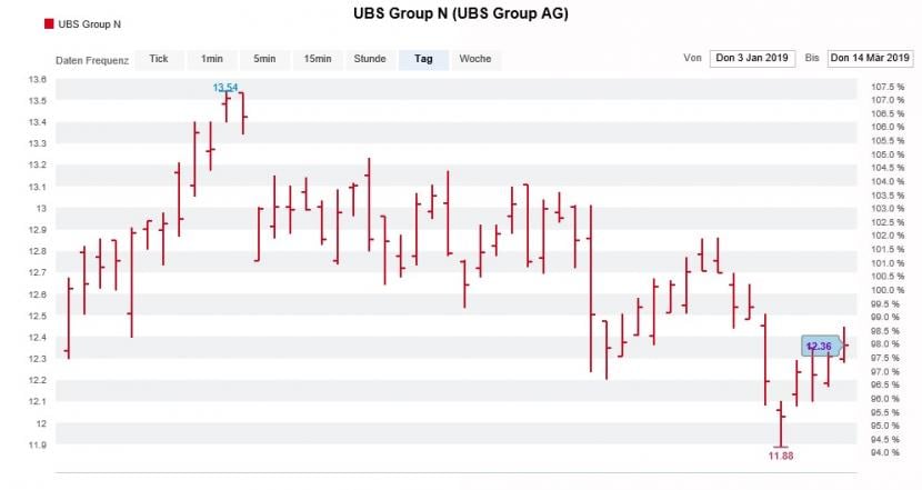 Mittlerweile trennen die UBS-Aktie gut 8 Prozent von den diesjährigen Höchstkursen von Ende Januar bei 13,53 Franken. Mit einem Plus von gerademal 1 Prozent seit Jahresbeginn gehört die Aktie zu den SMI-Titeln mit der schwächsten Bilanz in diesem Jahr. Händler verweisen dabei auf die unerwartet hohe Strafe gegen die Grossbank in Paris (cash berichtete).