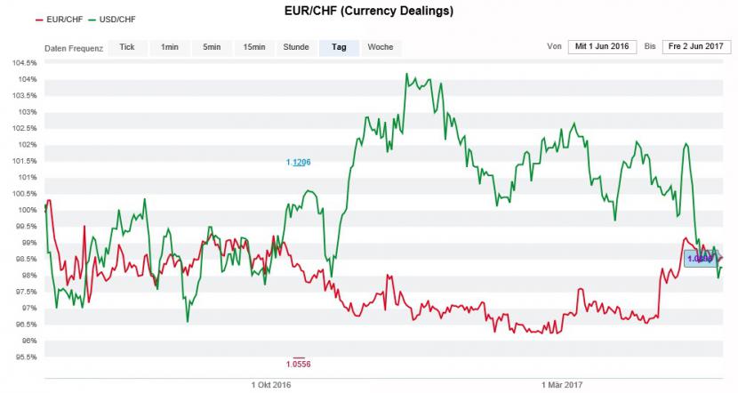 Kursentwicklung des Euro (rot) sowie des Dollar (grün) zum Franken (Quelle: www.cash.ch)