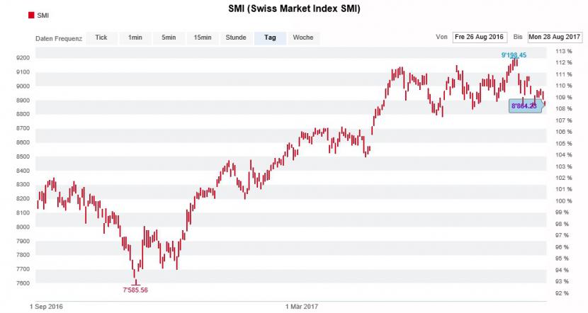 Seit nahezu vier Monaten bewegt sich der Swiss Market Index (SMI) in einem engen Kursband von plus/minus 200 Punkten rund um die als wichtig geltende Marke von 9000 Punkten. Am Dienstag im vorbörslichen Handel fällt das Börsenbarometer nun sogar in unmittelbare Reichweite zum Zwischentief von Mitte Juni bei 8778 Zählern.
