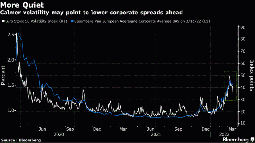 Ein weiterer Katalysator ist die sinkende Volatilität, die auf eine Beruhigung der Kreditspreads in Europa hindeuten könnte, was Aktien zugute kommt.