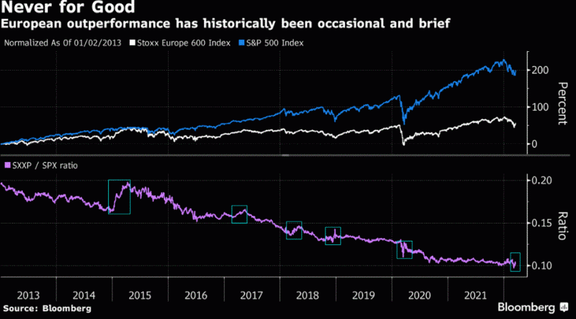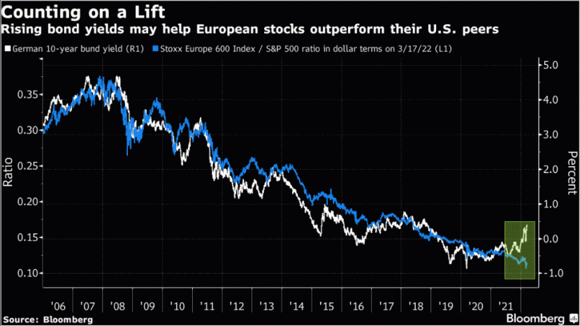 Da die US-Notenbank nun einen schnellen Straffungskurs einleitet, könnte Europa von der hohen Präsenz value-orientierter Sektoren wie Finanzwerte und zyklische Werte profitieren. Das hohe Engagement des US-Marktes in teureren Technologiewerten könnte zu einer Belastung werden.