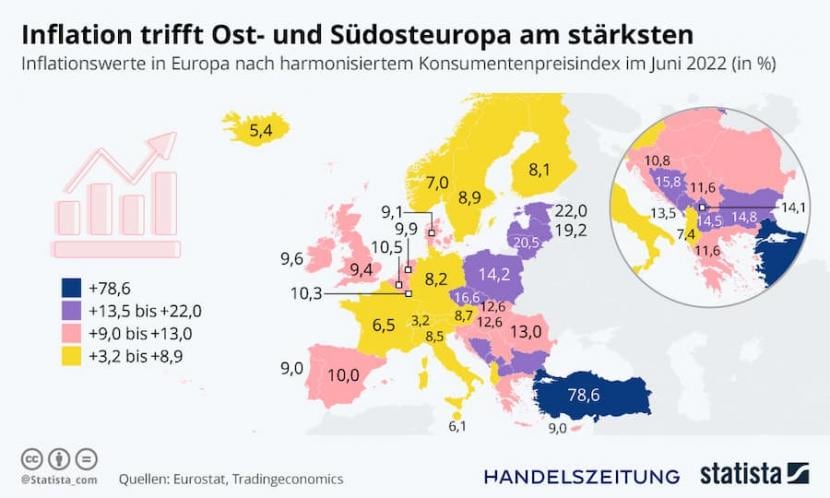 Diese Entwicklung schlägt sich auch in der geografischen Verteilung der Inflation in Europa nieder. Während viele Länder Osteuropas mit zweistelligen Teuerungsraten kämpfen, sieht es im Westen besser aus.