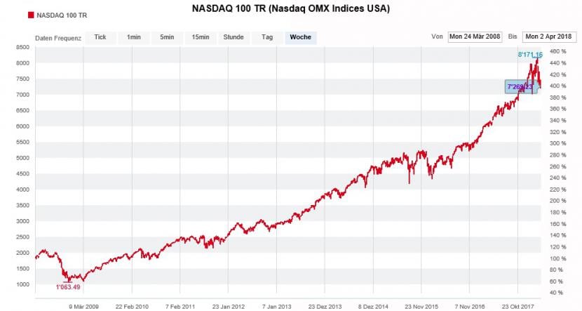 Beeindruckender Anstieg des Nasdaq-100-Index über die letzten zehn Jahre (Quelle: www.cash.ch)