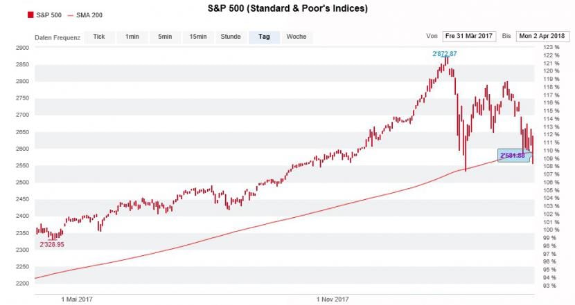 Schlimm erwischte es den S&P-500-Index. Das Börsenbarometer - es steht für die Kursentwicklung der 500 grössten US-Unternehmen - ging Montagnacht erstmals seit Ende Juni 2016 unter seinem 200-Tage-Durchschnitt aus dem Handel. Findet der S&P-500-Index nicht rasch wieder darüber zurück, steigt in New York die Gefahr eines grundlegenden Stimmungsumschwungs.