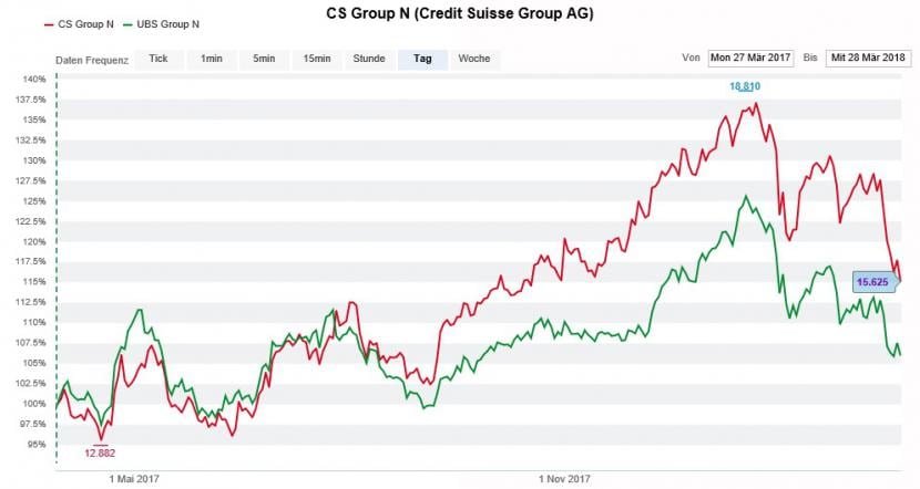Die Aktien von Credit Suisse (rot) und UBS (grün) nähern sich einander langsam wieder an. (Quelle: www.cash.ch)