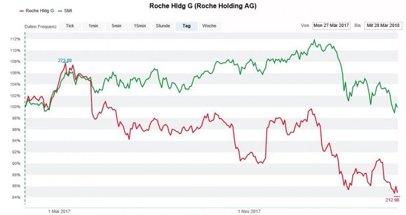 Die Bons von Roche (rot) befinden sich im Stimmungstief und belasten den SMI (grün). (Quelle: www.cash.ch)