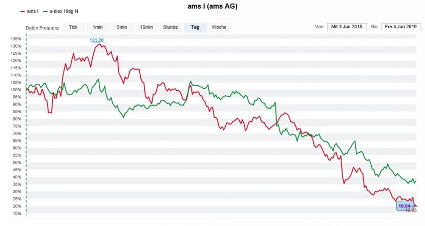 Beide Unternehmen blieben den auch so gefeierten Wachstumsaussichten vieles schuldig, weshalb sich der Technologieanalyst kontinuierlich zu Abwärtsrevisionen gezwungen sah - wobei er sich in guter Gesellschaft bewegte. Auch bei anderen Berufskollegen kam der dicke Rotstift zum Einsatz. Zuletzt lautete das Kursziel für die Aktien von AMS noch 42 Franken, jenes für die Papiere von U-blox immerhin noch 120 Franken.