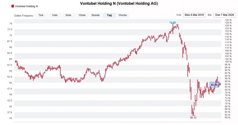 Kursentwicklung der Vontobel-Aktien über die letzten 12 Monate (Quelle: www.cash.ch)