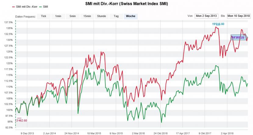 Der um Dividendenabgänge bereinigte SMIC (rot) widerspiegelt die Schweizer Blue Chips über fünf Jahre besser als der SMI (grün) (Quelle: www.cash.ch)