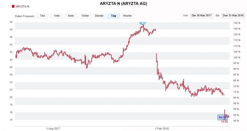 Die Aktien von Aryzta gleich mit zwei Luftlöchern in der Kursentwicklung der letzten 12 Monate. (Quelle: www.cash.ch)