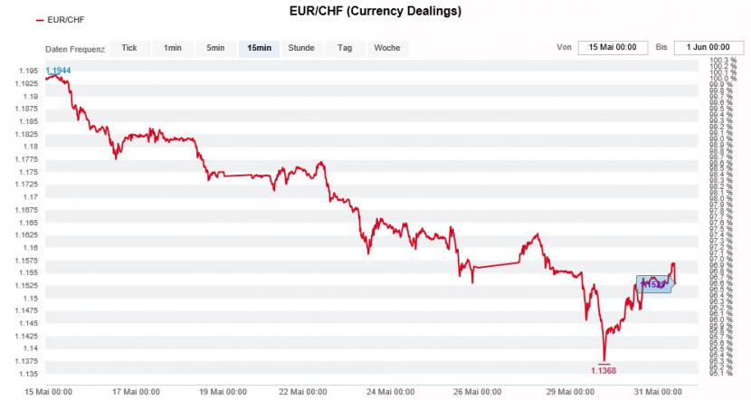 Entwicklung des Euro-Franken-Kurses über die letzten zwei Wochen. (Quelle: www.cash.ch)